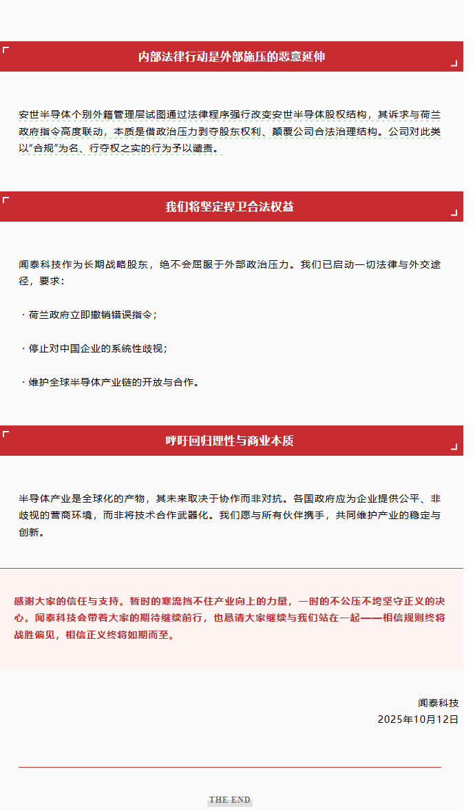 此外,荷兰时间2025年10月1日,安世半导体控股以及安世半导体(荷兰注册主体)法定董事兼首席法务官RubenLichtenberg(CLO,荷兰籍)在获得其他两位高管,即首席财务官StefanTilger(CFO,德国籍)以及首席运营官AchimKempe(COO,德国籍)的支持下,代表安世半导体以及安世半导体控股向企业法庭提交了启动对公司调查与采取临时措施的紧急请求。同日,企业法庭在未庭审的情况下直接即时生效了几项紧急措施,包括暂停张学政担任安世半导体控股公司执行董事及安世半导体公司非执行董事职务,暂停执行安世半导体董事会规则第3条之效力(即作为CEO的职务和职权)以及自当日起,将裕成控股有限公司(公司注册于中国香港的全资子公司,系安世半导体控股的唯一股东,以下简称“裕成控股”)持有的安世半导体控股的股份以管理权形式托管给独立第三方管理,上述措施持续至2025年10月6日口头听证后对即时措施申请作出裁决为止。