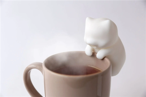 这个小猫可以挂在杯子边上,吹气给热饮降温,3 分钟内能把滚烫的咖啡吹到适饮温度。