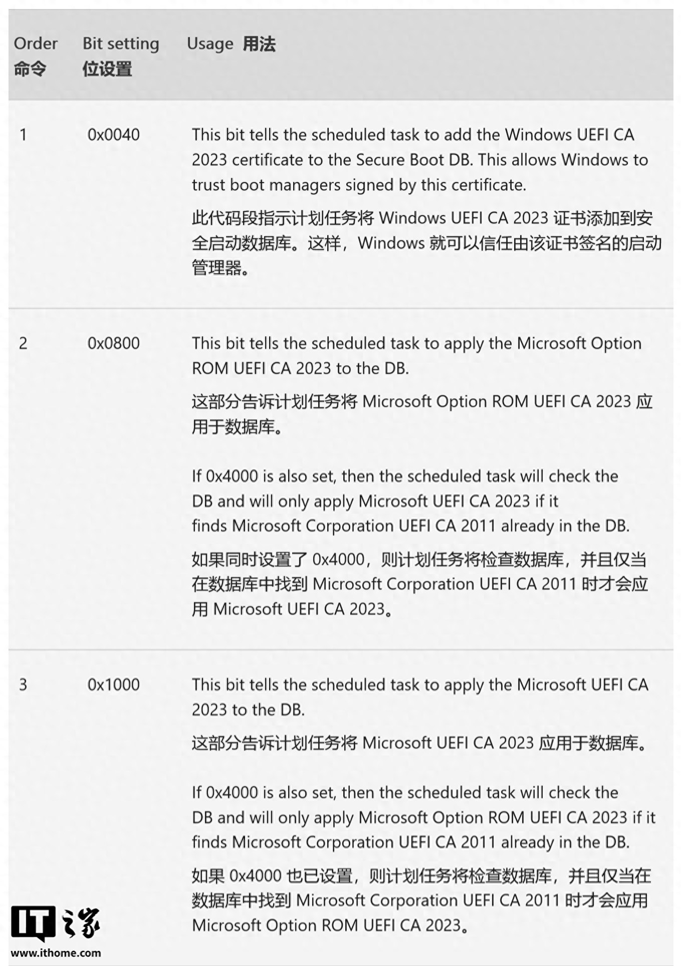 具体来说,错误出在用于触发计划任务安装证书的控制位上。根据微软的文档,控制位 0x0800 本应用来安装“Microsoft UEFI CA 2023”证书,而 0x1000 则用于安装“Microsoft Option ROM CA 2023”证书。