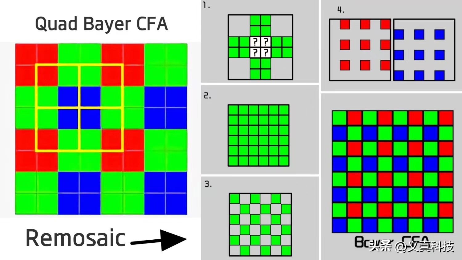 这样一块5000万像素的传感器其等效像素就约为2222万,即相当于同样像素数量普通 Bayer 传感器等效像素的约89%,也就是说 Quad Bayer 传感器其高像素模式存在少量细节损失。
