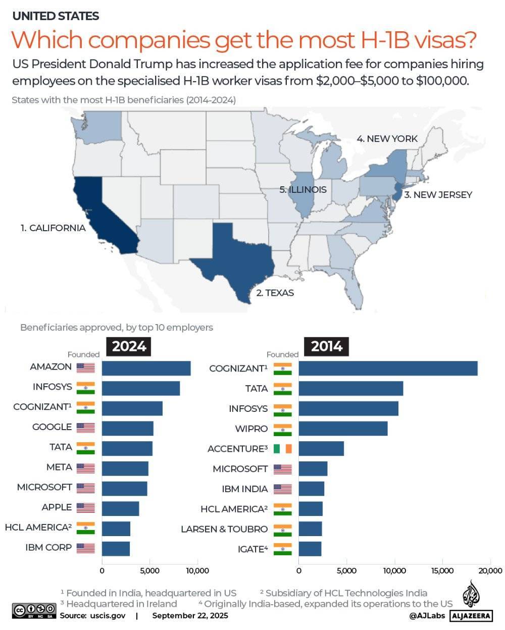 根据美国公民及移民服务局的数据,在2009年至2025年6月30日期间,累计获得美国H-1B签证数量最多的前四家公司为: