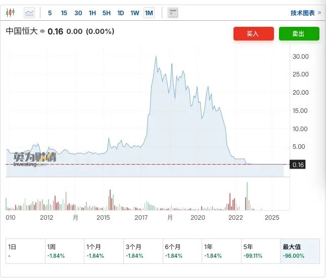 2009年11月,中国恒大在港交所上市,2017年10月,市值达到4144亿港元的峰值;2025年8月22日,中国恒大最后一个交易日,最后一单股票交易成交价定格于0.163港元,市值21.5亿港元,背负几千亿港币的巨债。