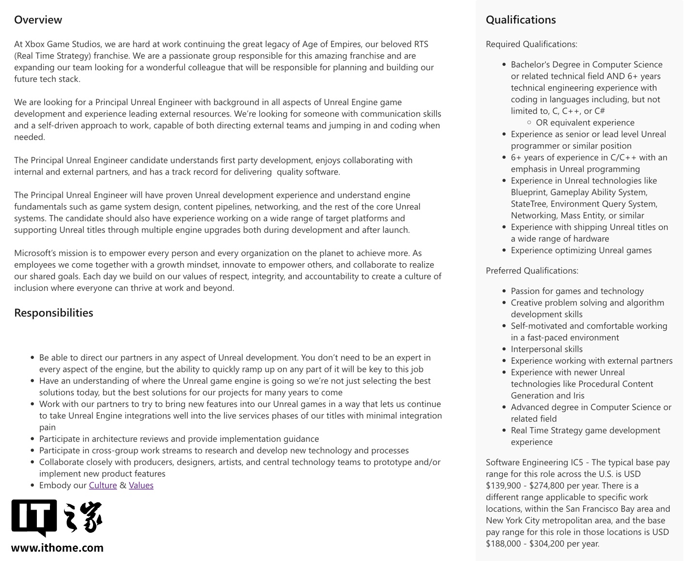 招聘启事中写道:“在 Xbox Game Studios,我们致力于延续《帝国时代》这一深受玩家喜爱的 RTS 系列。我们是一支充满热情的团队,现正扩充阵容,寻找一位首席 Unreal 工程师,负责规划与构建下一代技术架构,要求熟悉虚幻引擎的各项开发流程,并具备领导外部团队的经验。”