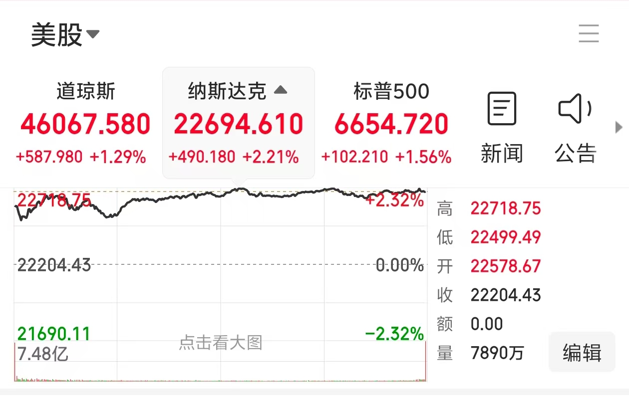 美股三大指数集体收涨,道指涨1.29%,纳指涨2.21%,标普500指数涨1.56%。纳斯达克中国金龙指数收涨3.21%,热门中概股普涨。