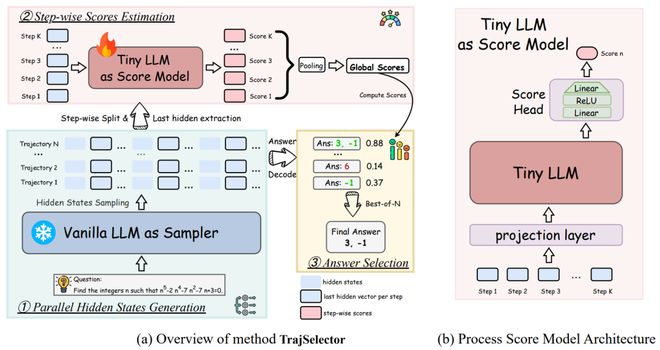 本文的研究试图去弥补这类研究的缺陷,并提出了TrajSelector 方法:一种轻量级但强大的 Best-of-N 策略,它通过复用大模型自身的 “隐藏状态” 来评估推理路径质量,无需昂贵的过程标注或 7B 参数的奖励模型,就能在数学推理任务中取得显著性能提升。