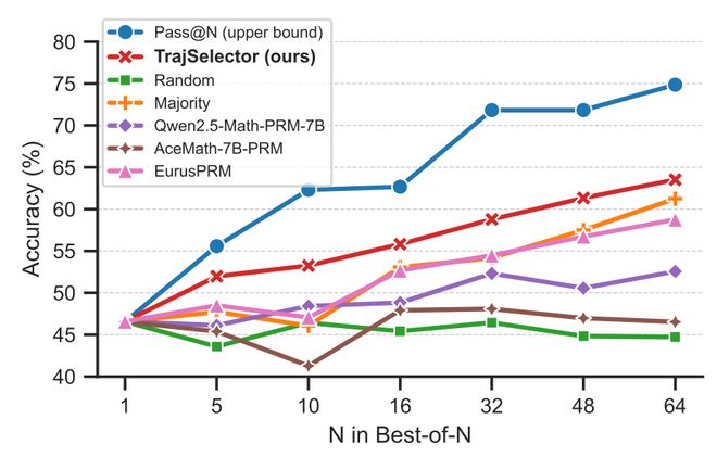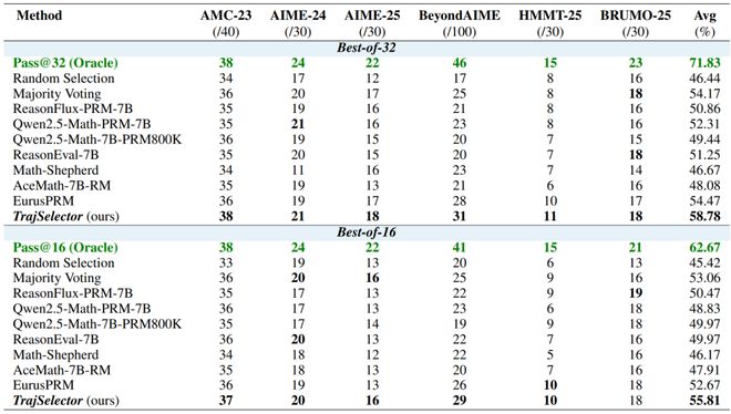 3. 聚合选优:TrajSelector 使用了最简单的算术平均来计算每个推理路径的得分情况,得出每一个的全局分数,进行选择出全局分数最高的路径作为最终答案。