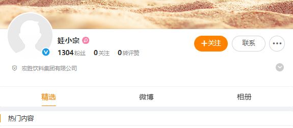 今日,“娃小宗”微博账号完成平台认证,认证主体为宏胜饮料集团有限公司。该账号的审核通过时间为9月30日,截至发稿,粉丝数为1304,且暂未发布任何内容。