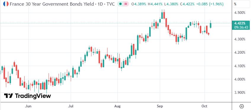 法国债券市场也对这一消息反应强烈,30年期国债债券收益率一度触及一个月高点4.441%,现略微回落至4.422%,日内涨幅仍超过8个基点。